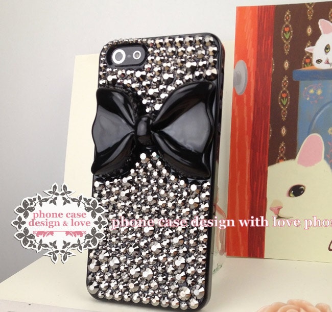 Studded Rhinestone iPhone 6 iPhone 6Plus iPhone 5 iPhone 5s Cover Case Black Cover With Black Bow Handmade