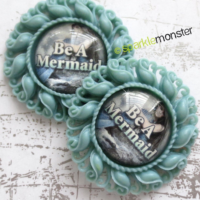 Be A Mermaid - 2pcs, USA seller, filigree cabochon, resin, glass, deco, blue, cameo