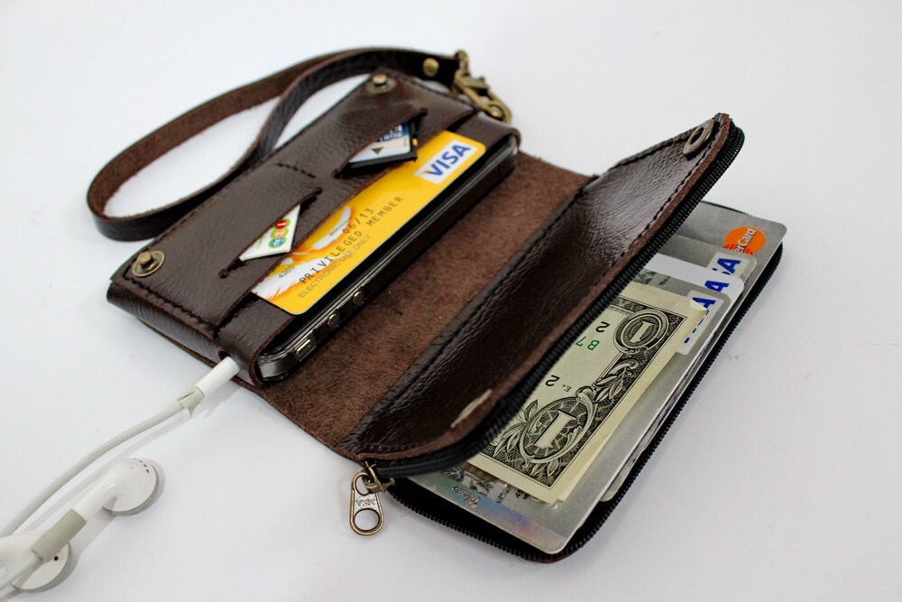 Dark chocolate bifold leather iPhone wallet wristlet with large zipper