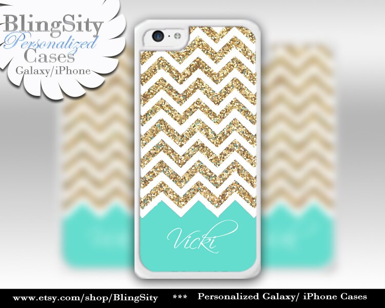 Gold Sparkle Mint Monogram iPhone 5C 6 Plus Case, iPhone 4 Case, iPhone 5S Ipod 4 5 White Chevron Personalized Name *NOT actual Glitter